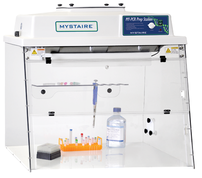 Mystaire® MY‑PCR prep stations are compact laminar flow enclosures that reduce the risk of sample contamination while performing polymerase chain reaction experiments. Airborne contaminants are prevented from entering into the work zone through constant positive pressure HEPA filtered air. Each PCR prep station is equipped with a built-in 254 nanometer shortwave lamp to effectively decontaminate the work area between amplifications. Safety interlocks are included on all PCR prep stations to prevent operator exposure to potentially harmful UV radiation. MY‑PCR prep stations are bench‑top personal clean zones allowing the operator to amplify RNA and DNA while minimizing the potential for background from airborne contaminants.